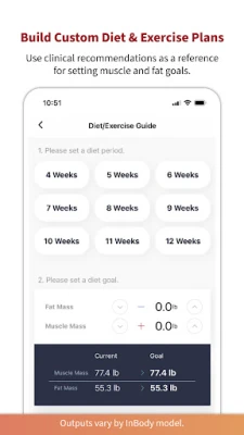 - A digital diet and exercise log that can be used to fit healthy changes into your current lifestyle. Within this section, you can also set attainable muscle and fat goals based on scientific data formulated by the InBody Clinical Research team. *Please note: The guide(s) are for reference purposes only and should not be taken as professional medical advice.