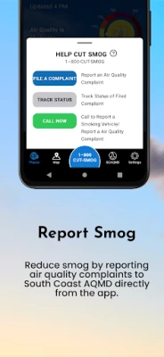 • Submit Air Quality Complaints – Easily report excessive odors, smoke, dust, or other air contaminants (except smoking vehicles). This new feature is conveniently located directly on 1-800 CUT-SMOG button. You are now able to file and keep track of the status of each complaint directly from the app.
